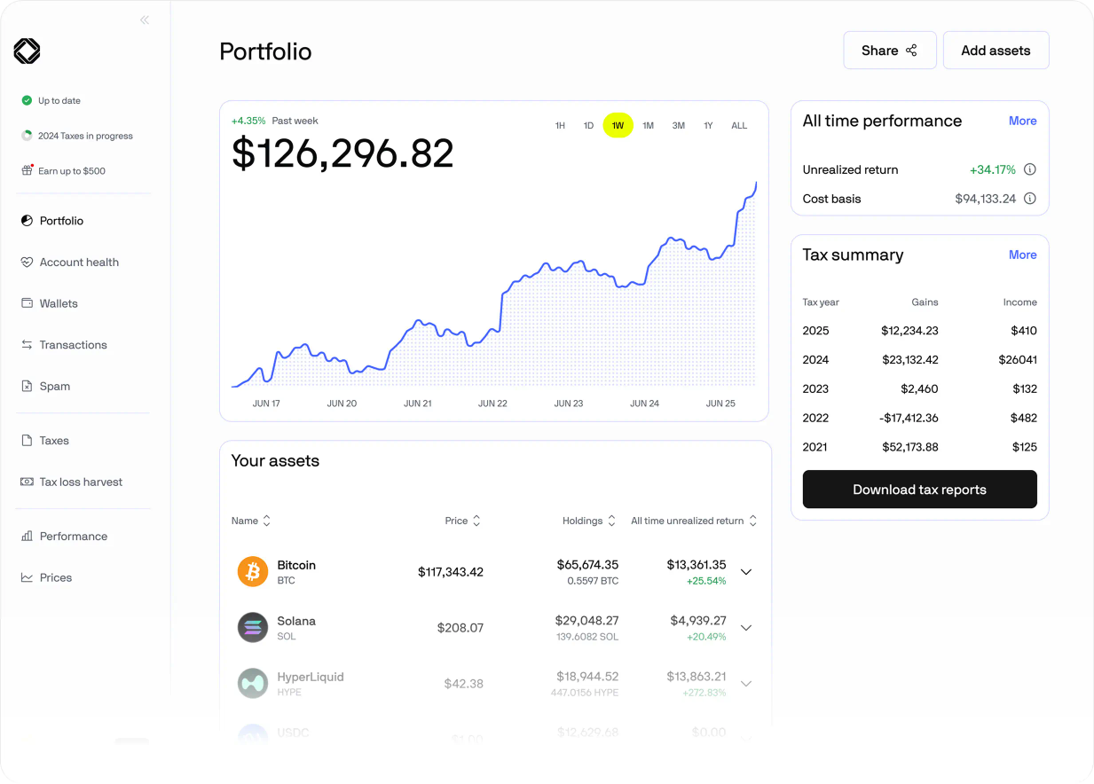 Get a clear, real-time overview of your crypto performance. See your portfolio value, track gains and losses, and understand your tax liability with easy-to-read charts and insights.